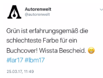 → Einschub: In der Woche nach der Buchmesse greife ich diesen Tweet mit der Autorenwelt übrigens auf und lasse euch unter einem eigens dafür erstellten Hashtag grüne Bücher zeigen, die euch begeistern. 🙂